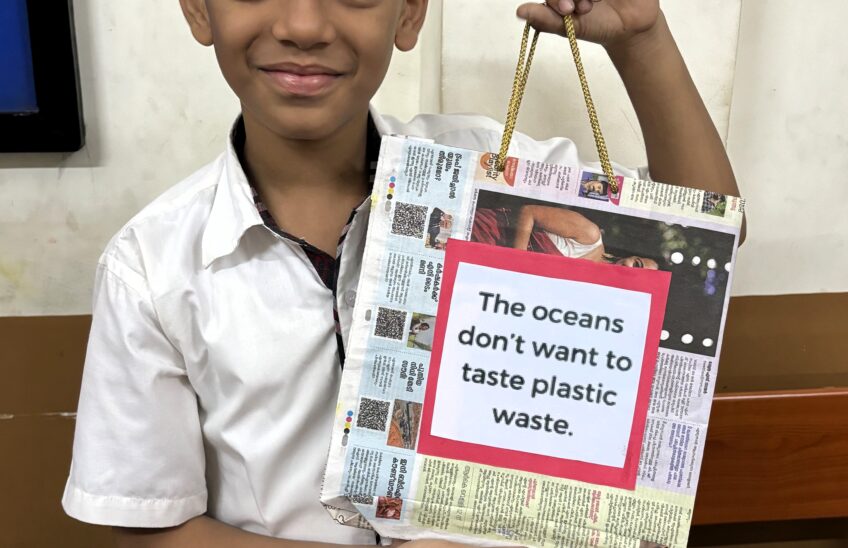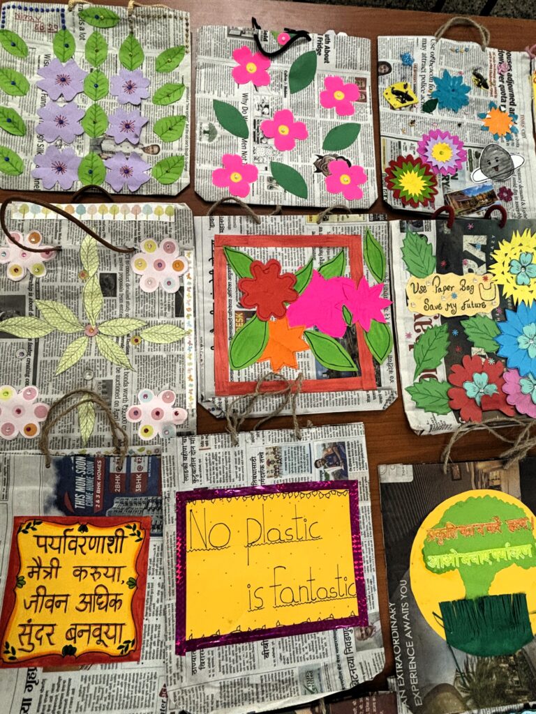 Students of grades V, VI, VII, and VIII and the teachers enthusiastically prepared and decorated attractive paper bags using old newspapers, wrote slogans, and handed over the paper bags to them for use over the plastic bags.