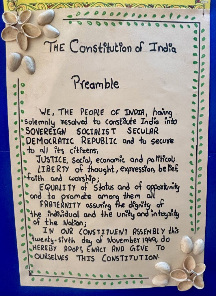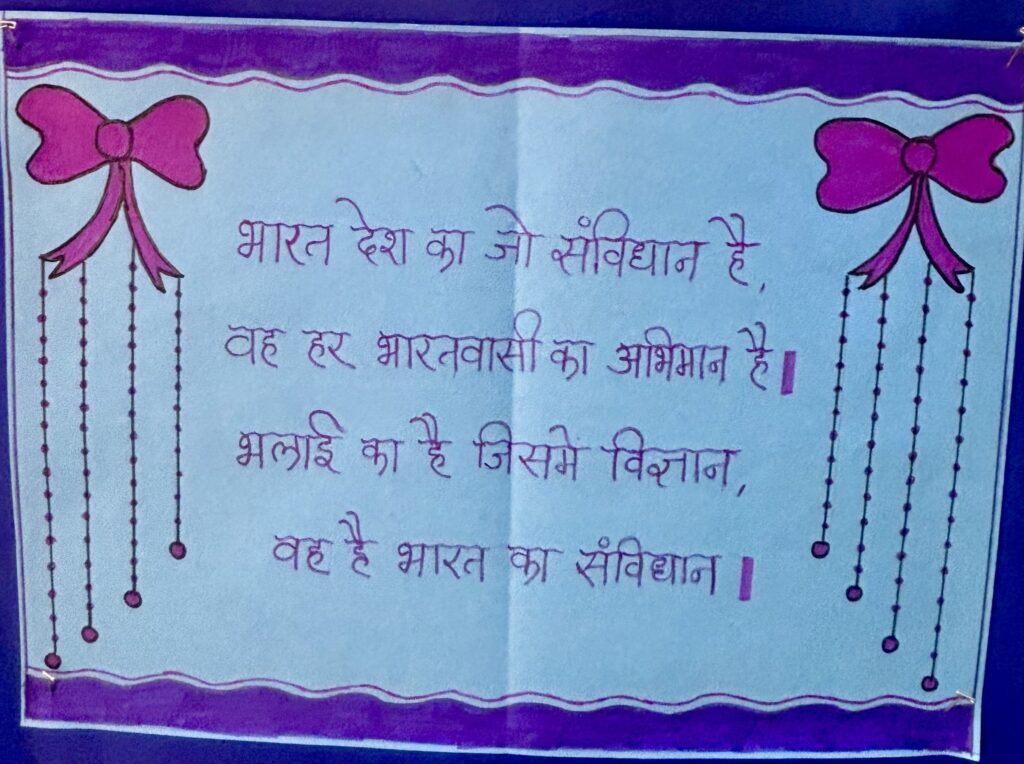 A quiz competition was organized for the students of Std 5, 6 and 7 to test their knowledge about the Constitution. An Essay Writing competition based on the Constitution was held for the students of Std 8 and 9. The winners of the Quiz and Essay competitions were given appreciation certificates and prizes. Students took a pledge to uphold the values enshrined in the Constitution. The display gallery highlighted the craft work of the students including handwritten slogans, the Preamble and the award winning essays.