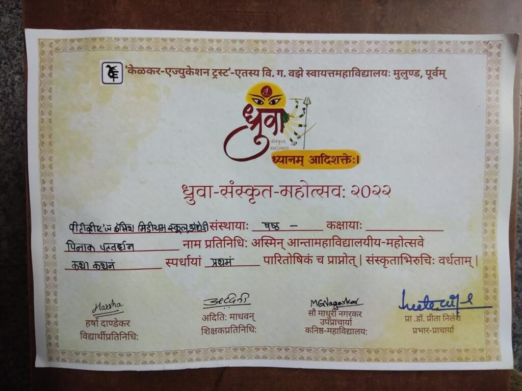 Glad to share the achievements of Parle Tilak Vidyalaya Association’s English Medium School, Andheri in the Dhruvaa Sanskrit Mahotsav held on 24th September 2022 at the Vaze-Kelkar College, Mulund.