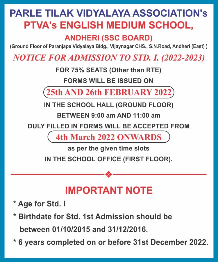 PTVA’s English Medium School, Andheri is affiliated to the SSC Board. Established on 21st June 2017, with a view to offering the best education in English language to the students residing in Andheri, Jogeshwari & nearby areas.