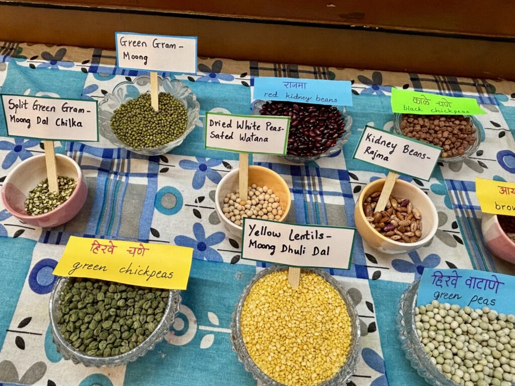 Students participated in classroom activity of identification of various types of pulses on the basis of their size, shape, and colour and texture which include Toor (Pigeon Pea), Chana (Chikpeas), Moong, Masoor (Red Lentil), Kabuli Chana, Rajma (Kidney Beans), Cowpea, Matki (Moth Bean), Urad (Black Lentil), etc.