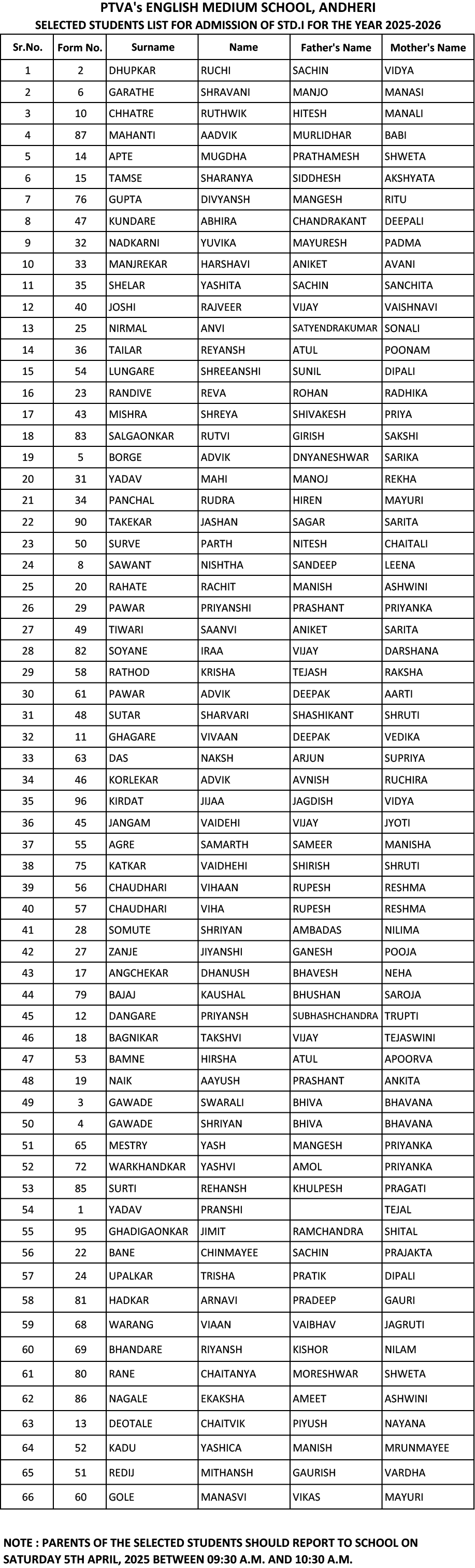 List of selected students in Std. 1 (2025-2026)