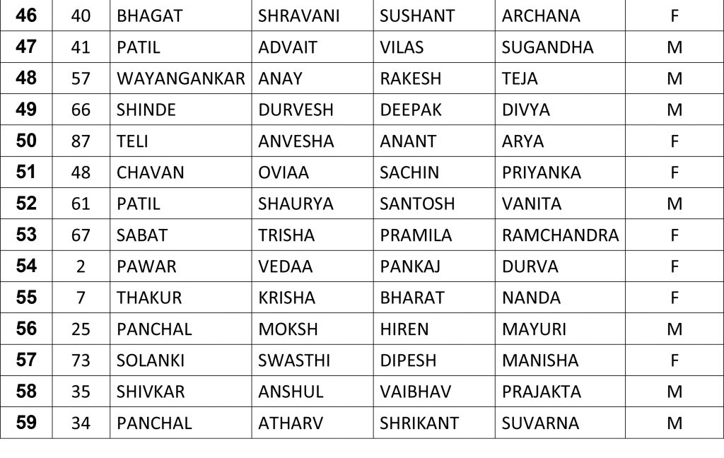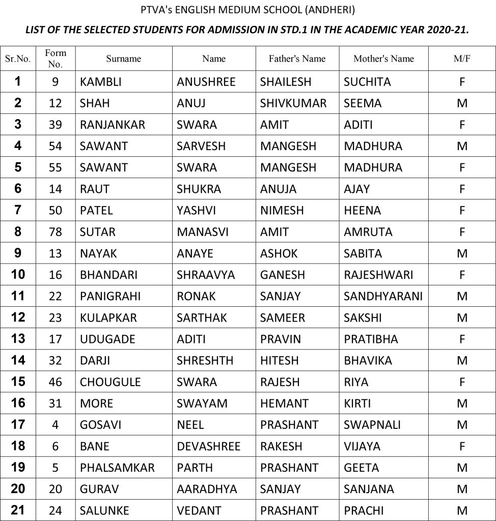 List of the selected students for admission in Std.1 in the academic year 2020-21.