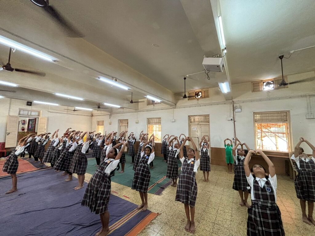 Miss Nidhi Khamkar of Std. 7 explained the importance of Yoga to the students in the school assembly. Students participated in the Yoga session volunteered by Ambika Yogashram experts. They practiced Omkar recitation, meditation, and simple body stretching exercises and poses. There was a Yoga session for the staff, too.