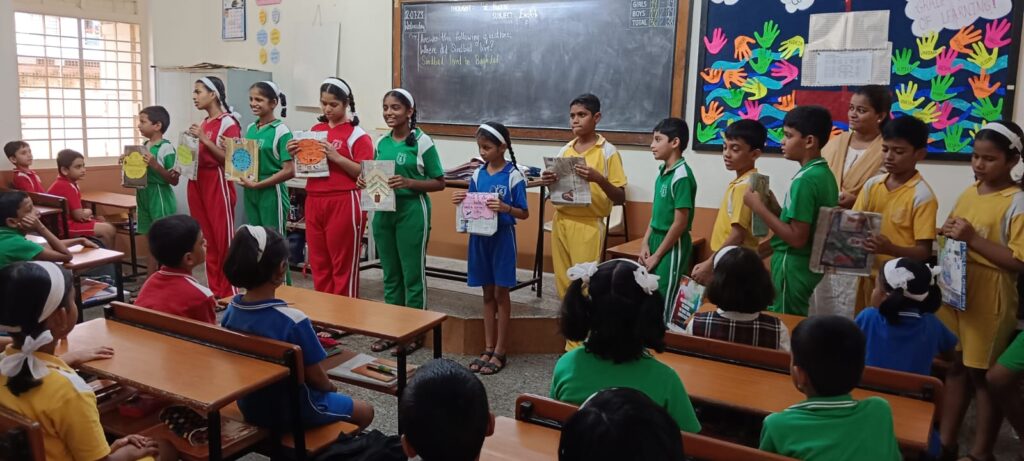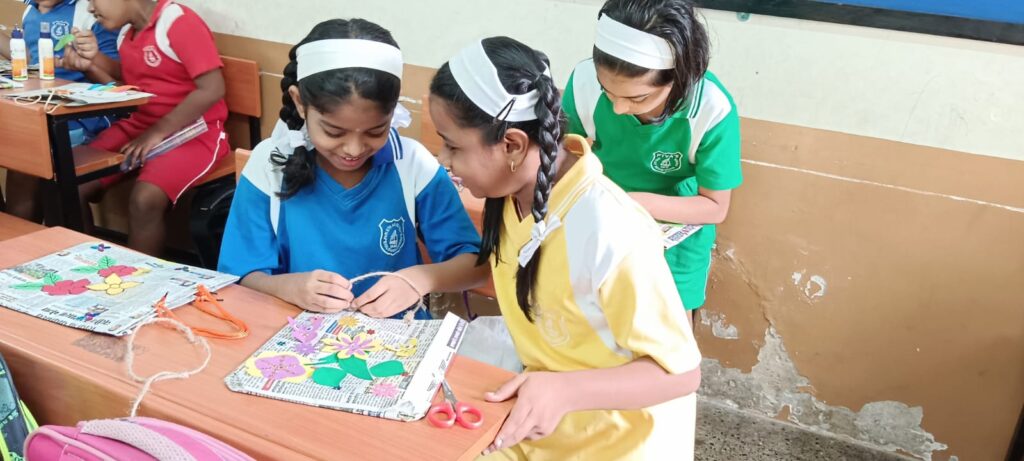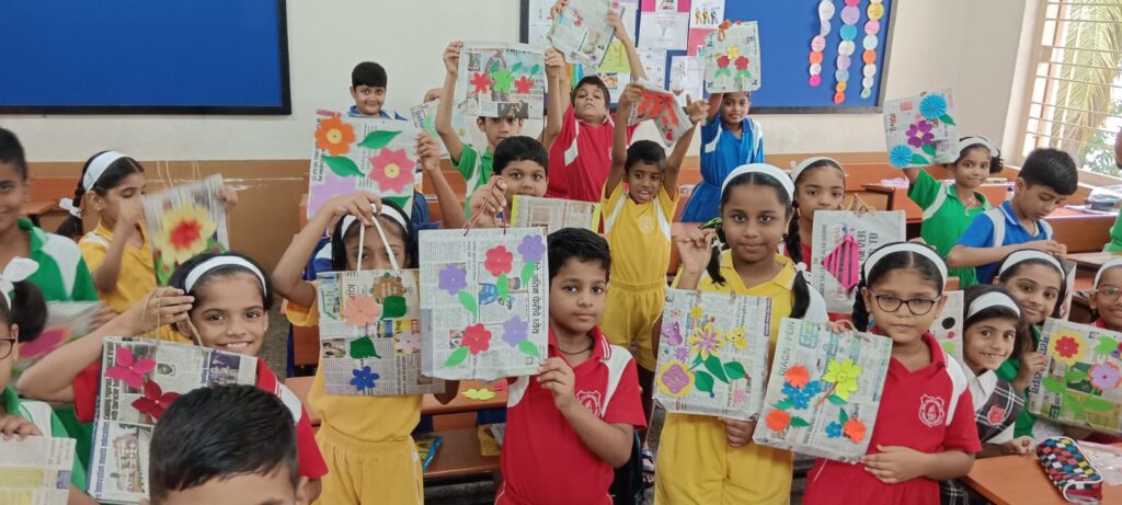 Harsh Shetkar (Std. VI) gave the oath to the students to use environment- friendly, lightweight, compact, and convenient paper bags in place of plastic bags. Students of Std. IV, V, VI, and VII prepared newspaper bags under the guidance of Art Teacher Ashwini Naravane and the class teachers. Collectively, they prepared 200+ paper bags.