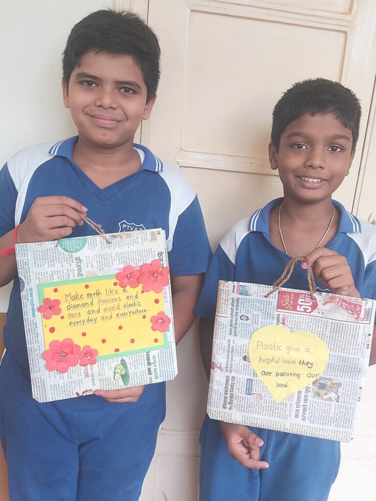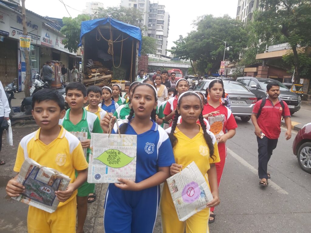 Students decorated these bags with beautiful paper flowers and wrote relevant slogans on them. जाणीव-जागृती – A roadshow and rally of students were organized under the guidance of Shweta Yadav teacher to spread awareness in the neighborhood about the use of paper bags. The enthusiastic students distributed the paper bags to local vendors and urged them to avoid plastic bags.
